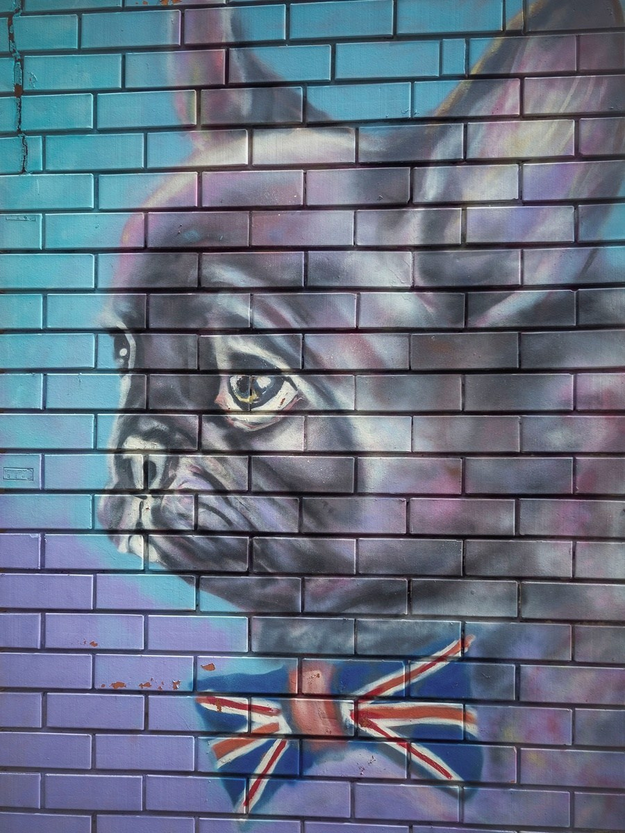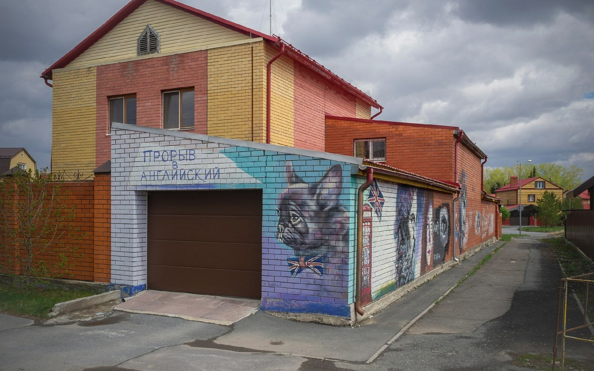 Начал с собачки. Она вместе с другими фрагментами одной большой работы до сих пор существует в одном из относительно новых районов Тюмени. Нарисовал её на одной из стен дома, в котором живут родители. У мамы открылась школа английского на дому. По этому случаю я решил разрисовать часть стен нашего дома. И первым делом изобразил собачку с бантом в виде флага Англии, хотя пёс — это французский бульдог. Эта собачка и была моим первым опытом в стрит-арте. С неё я начал свой путь. Это было летом 2019 года. Тогда я ещё мало знал о стрит-арте, почти ничего не знал ни о работе с баллончиками красок, ни о колпачках к ним. Просто взял и начал рисовать.